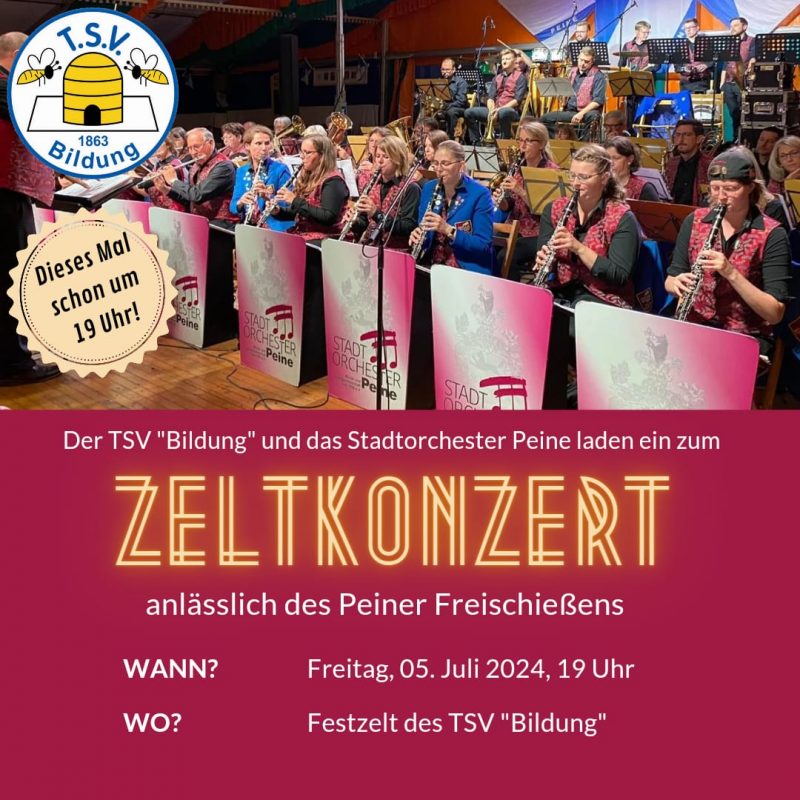 Im Rahmen des Peiner Freischießens findet auch im diesen Jahr unser Zeltkonzert im Zelt des TSV „Bildung“ statt! Das Große Orchester wird mit Pop-, Rock- und Schlagermusik für Stimmung und einen unvergesslichen Auftakt zu Peines 5. Jahreszeit sorgen!